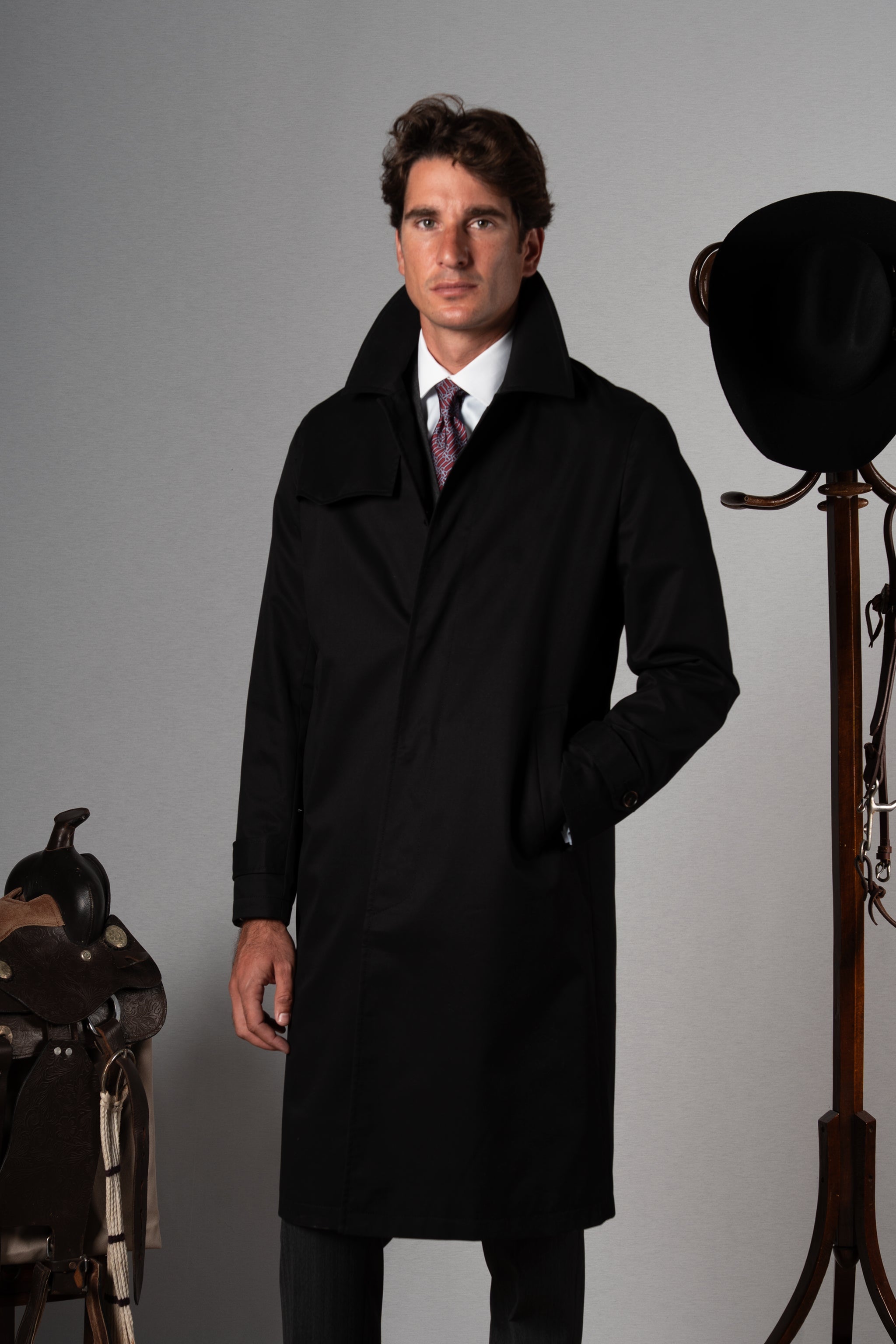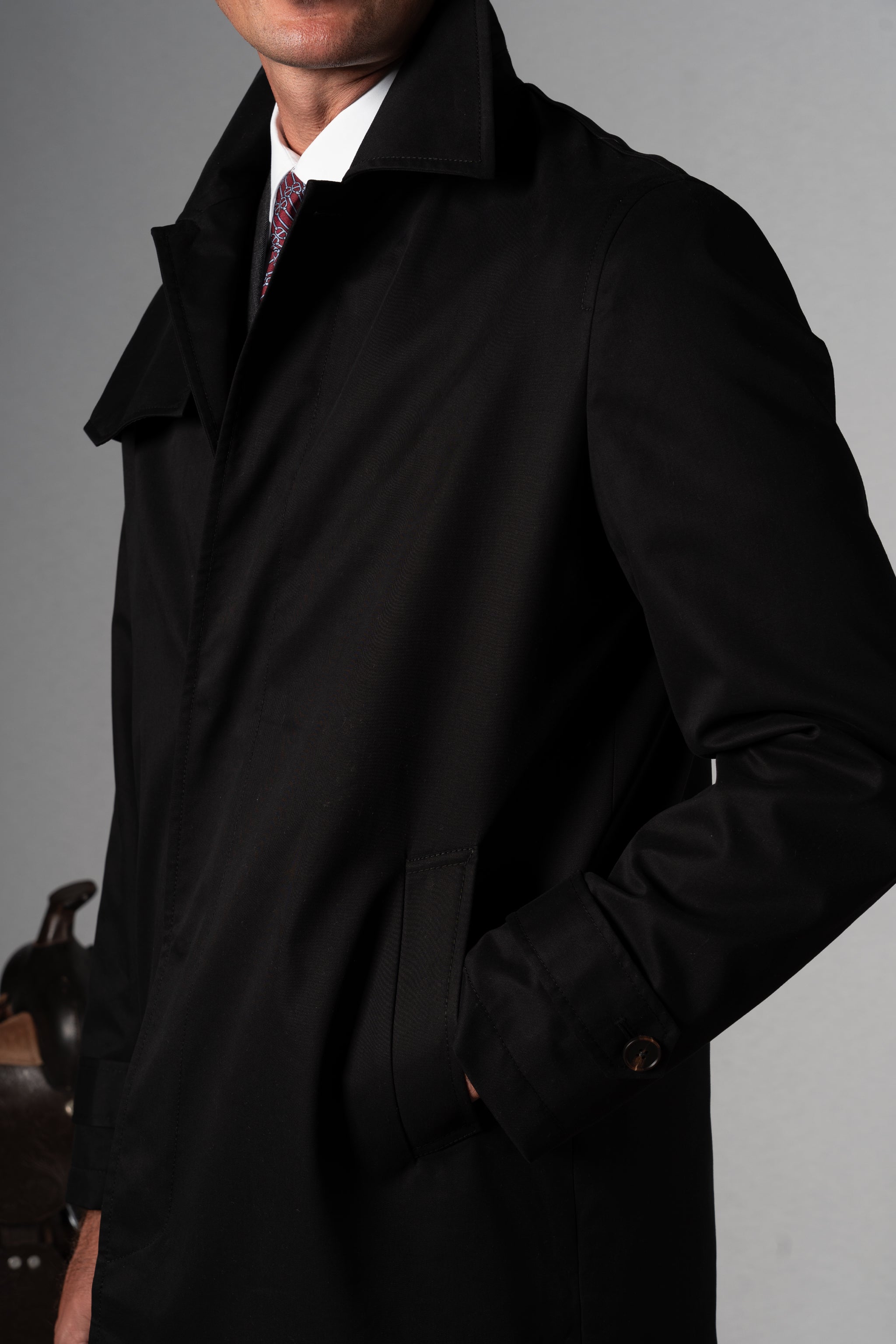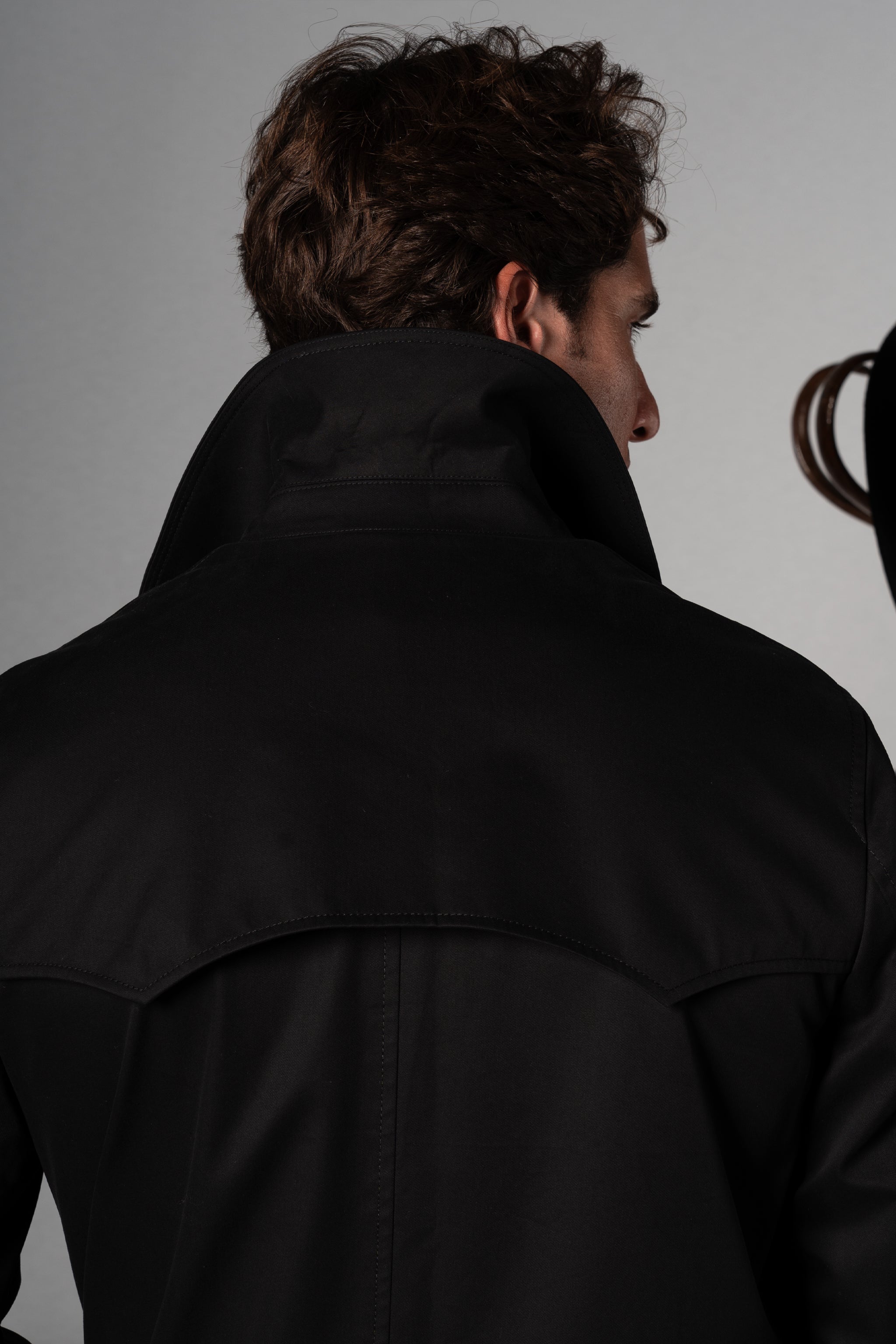 Esta gabardina negra está confeccionada en mezcla de algodón y Tencel de 290 g/m², un tejido ligero, suave al tacto y tratado para ser resistente al agua, perfecto para mantenerte seco sin perder estilo.