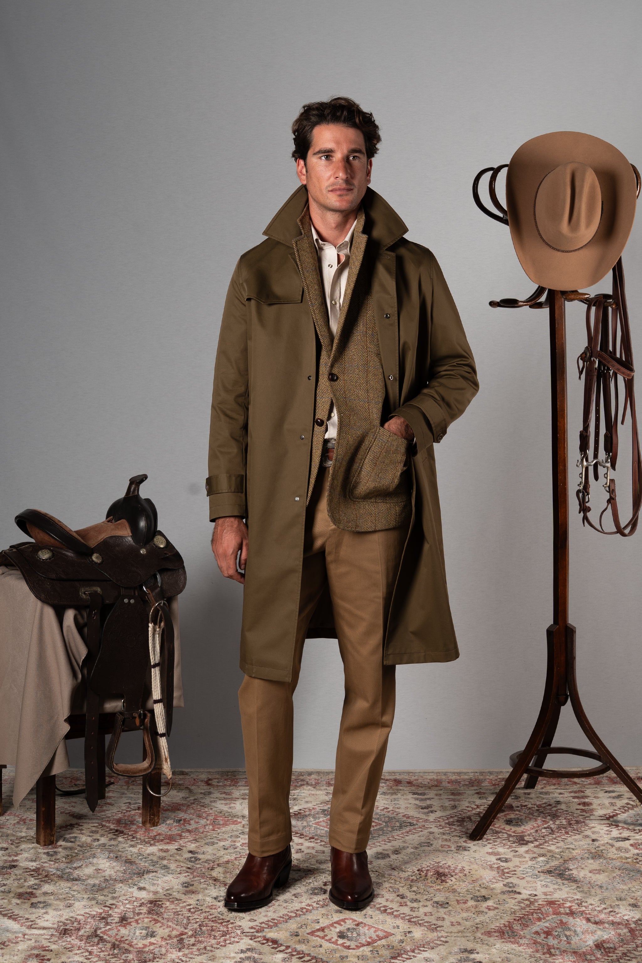 Esta gabardina verde está confeccionada en mezcla de algodón y Tencel de 290 g/m², un tejido ligero, suave al tacto y tratado para ser resistente al agua, perfecto para mantenerte seco sin perder estilo.
