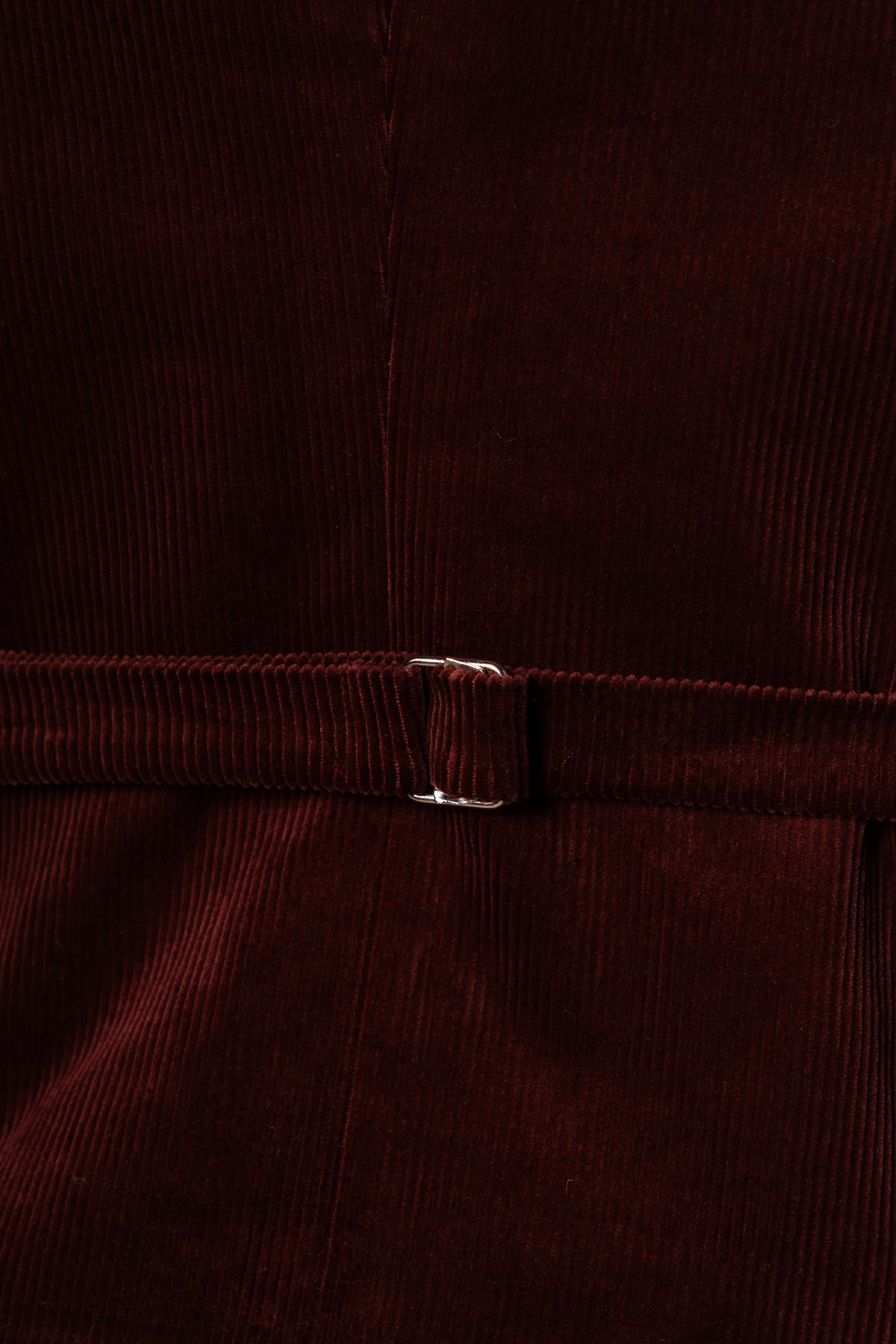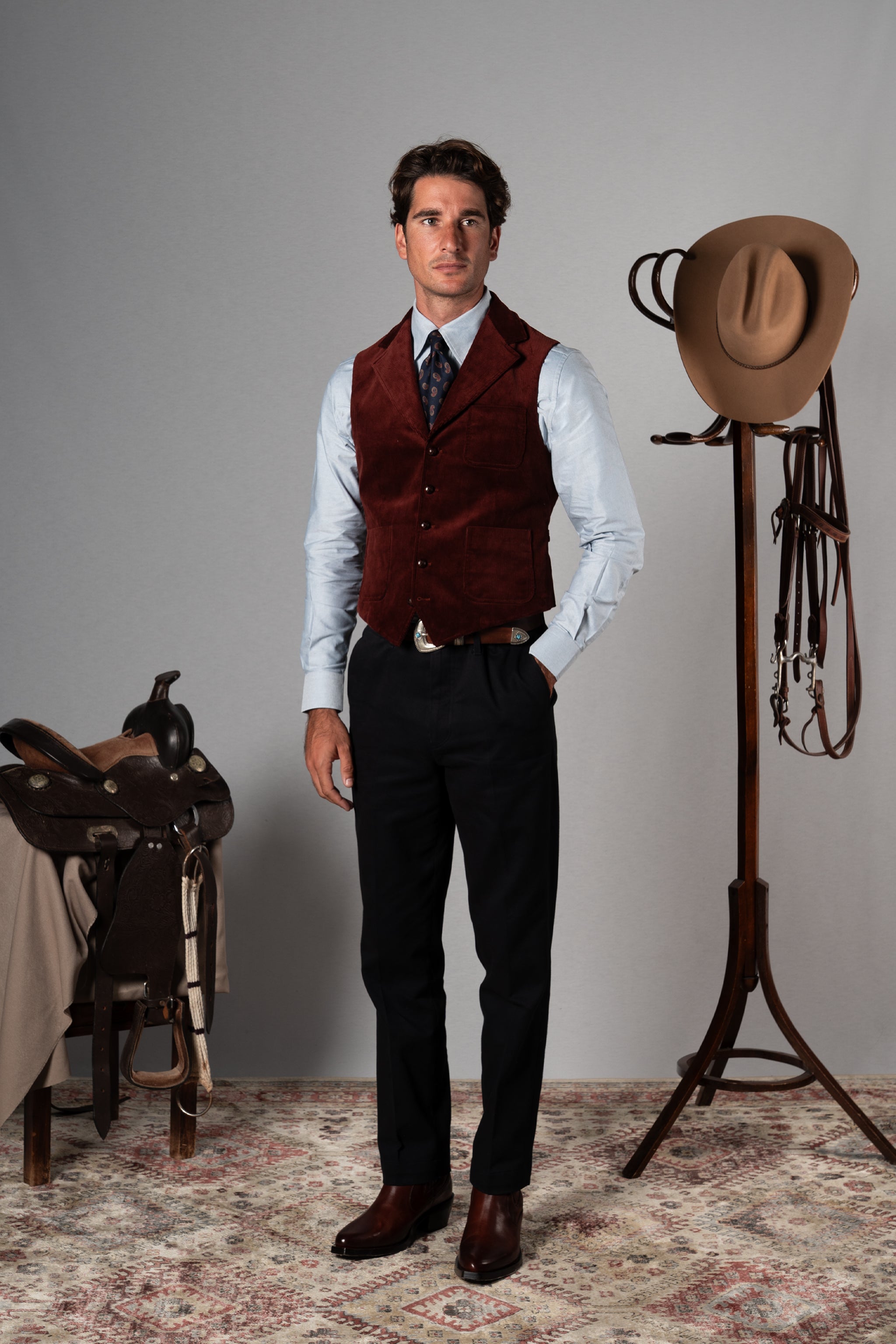 Este chaleco de pana burdeos, confeccionado en 97% algodón y 3% Spandex de 310 g/m², combina la textura cálida y distinguida de la pana con una silueta inspirada en la sastrería tradicional. Su estructura ligera y su tacto suave además de su capacidad elástica lo convierten en una prenda cómoda y versátil para combinar con americana o llevar como pieza protagonista en looks informales con camisa.