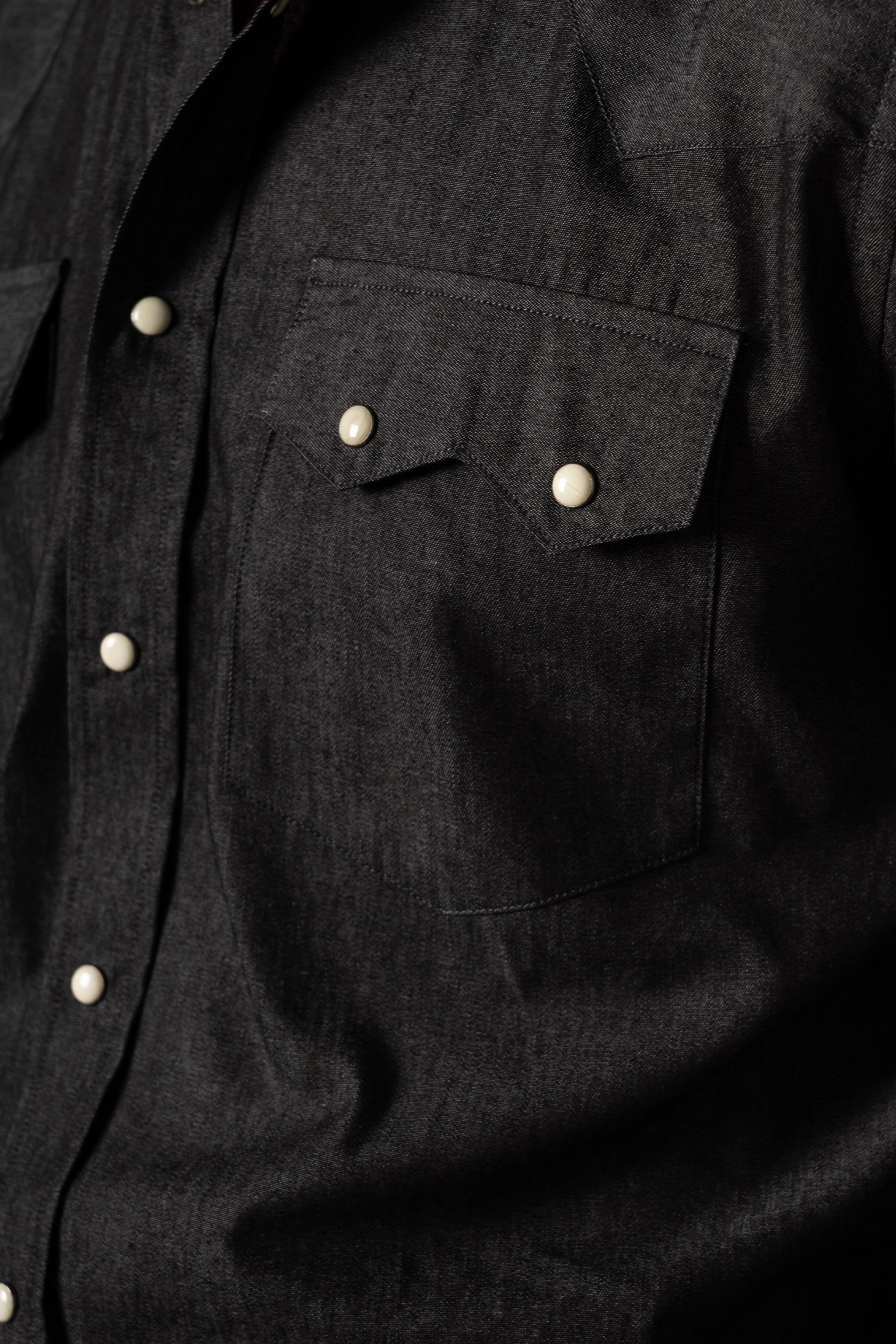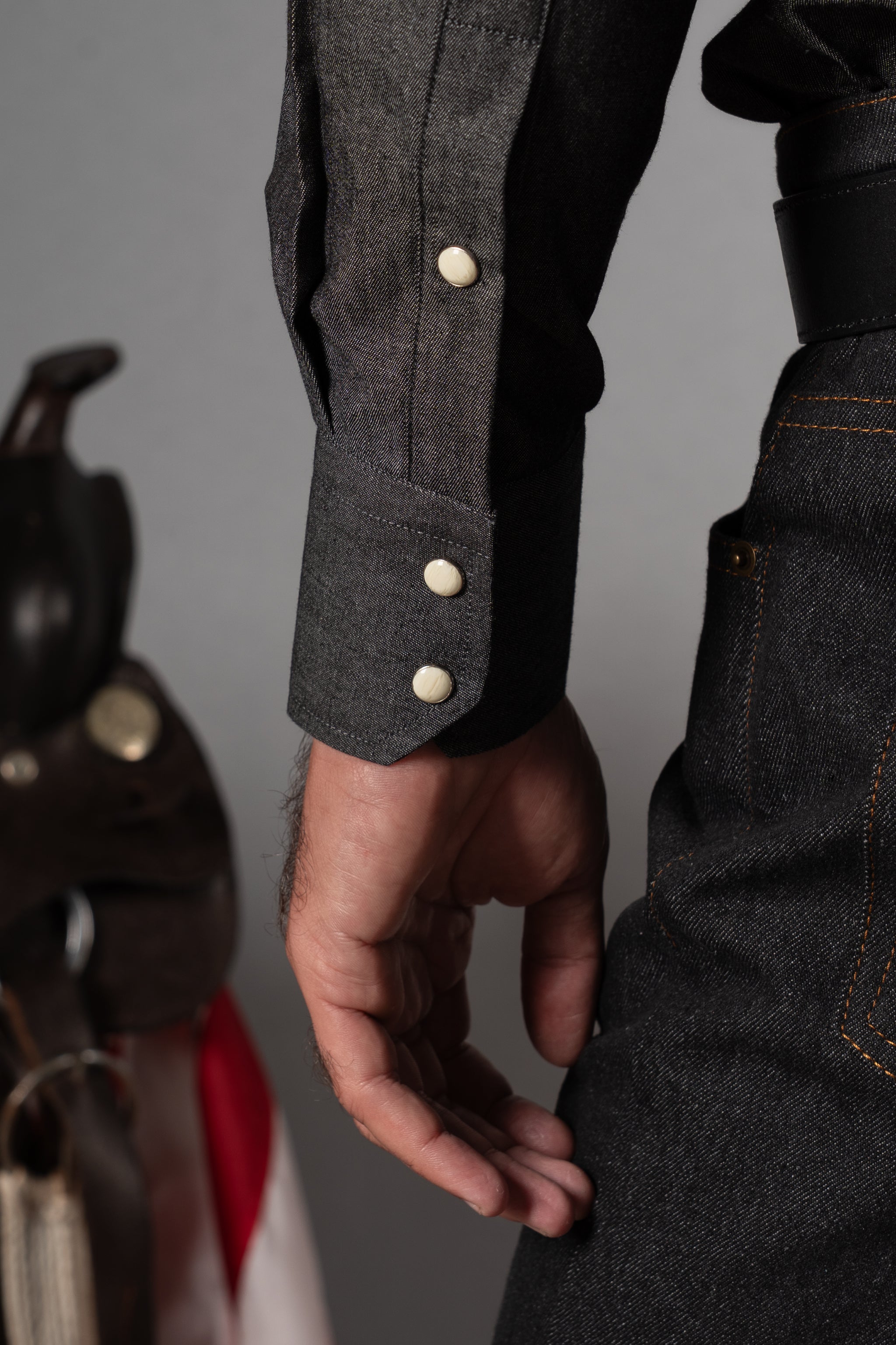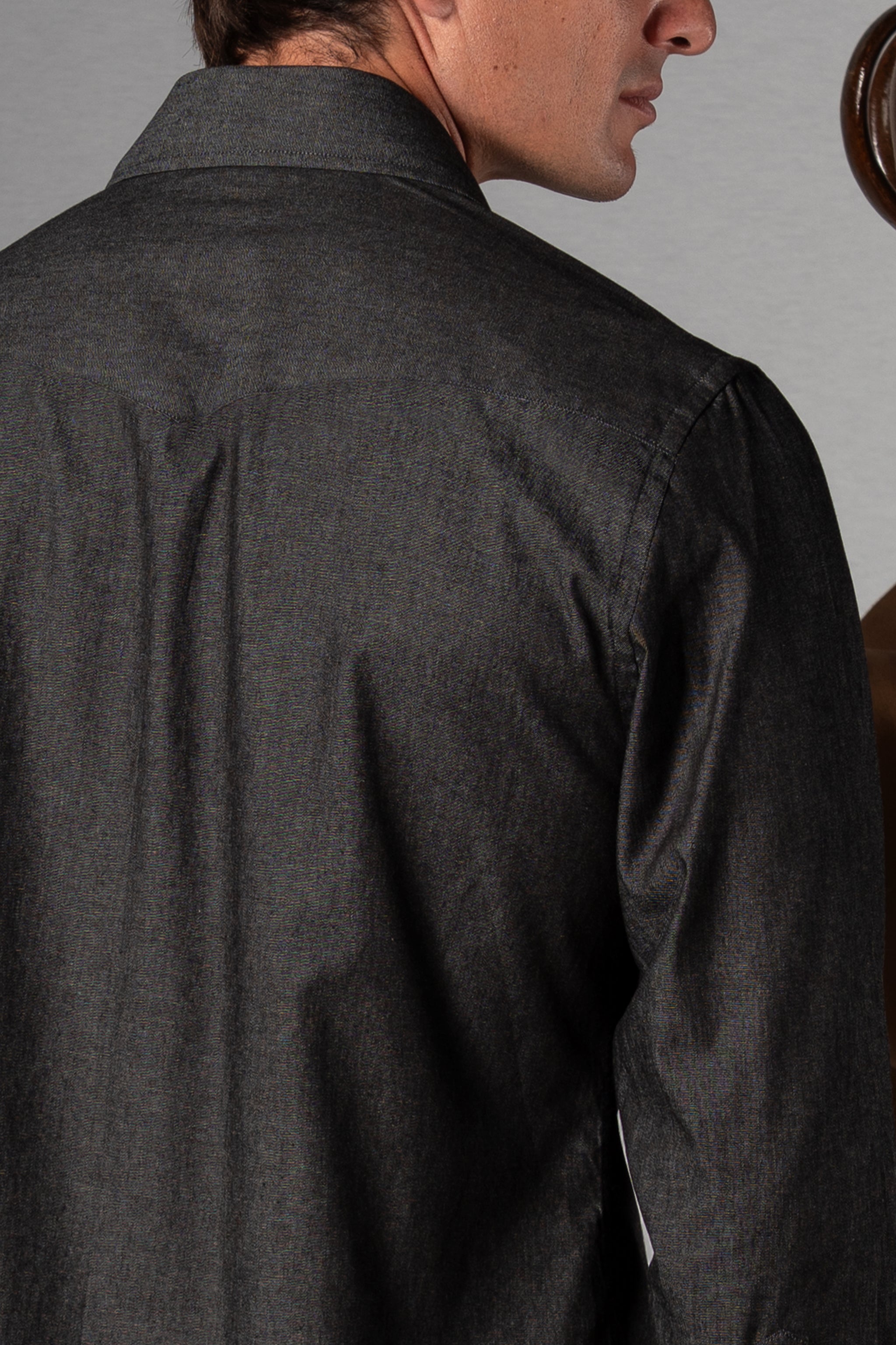 Esta camisa vaquera negra está confeccionada en 100% algodón y presenta un diseño western auténtico, con dos bolsillos en el pecho con tapeta y doble pico, además de botones de corchete metálicos que refuerzan su carácter.