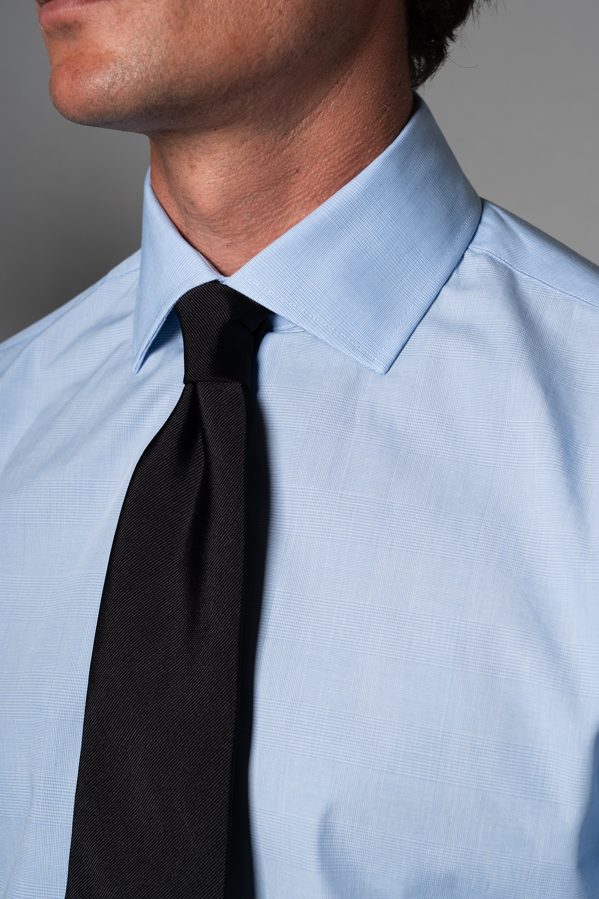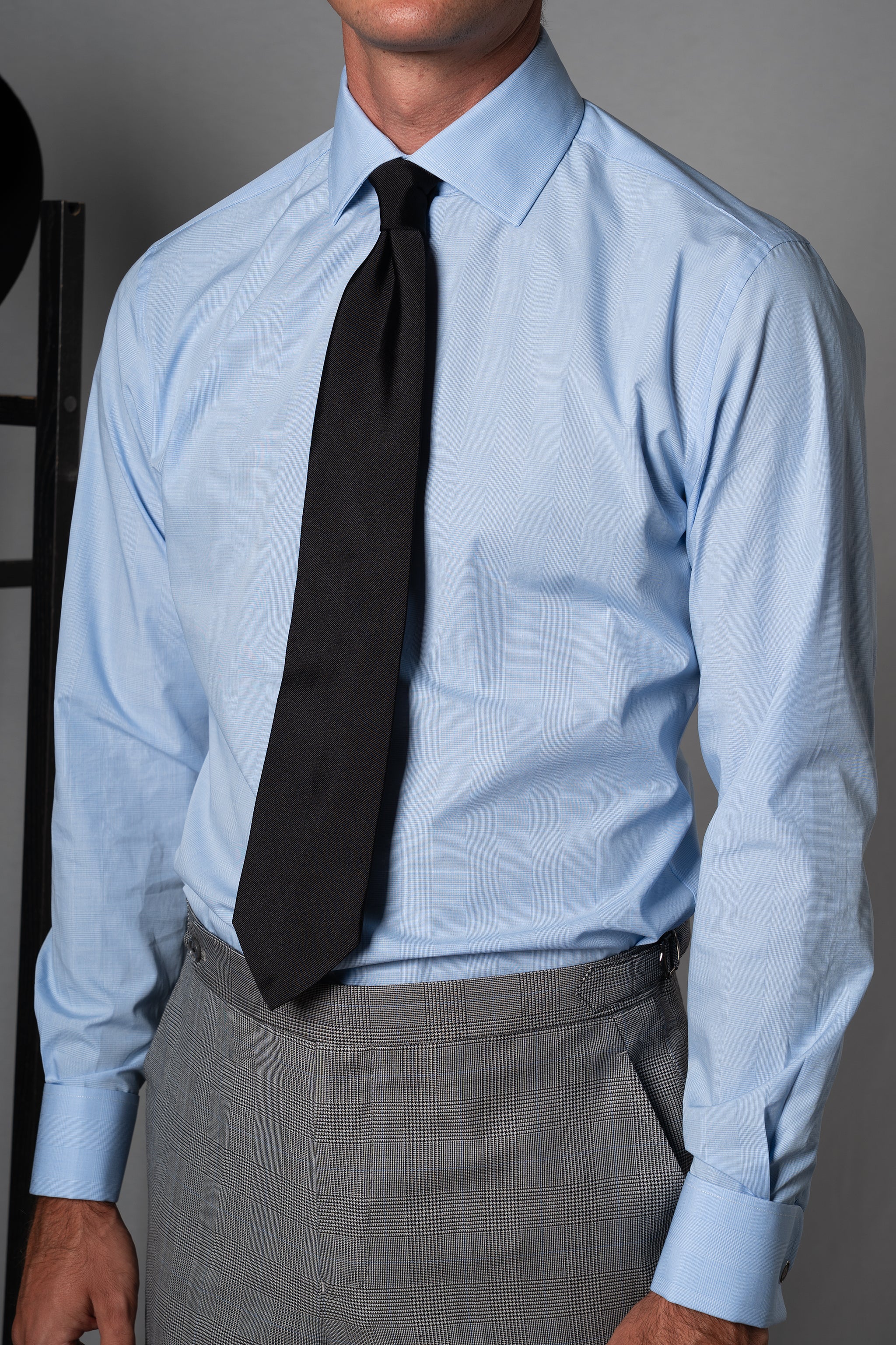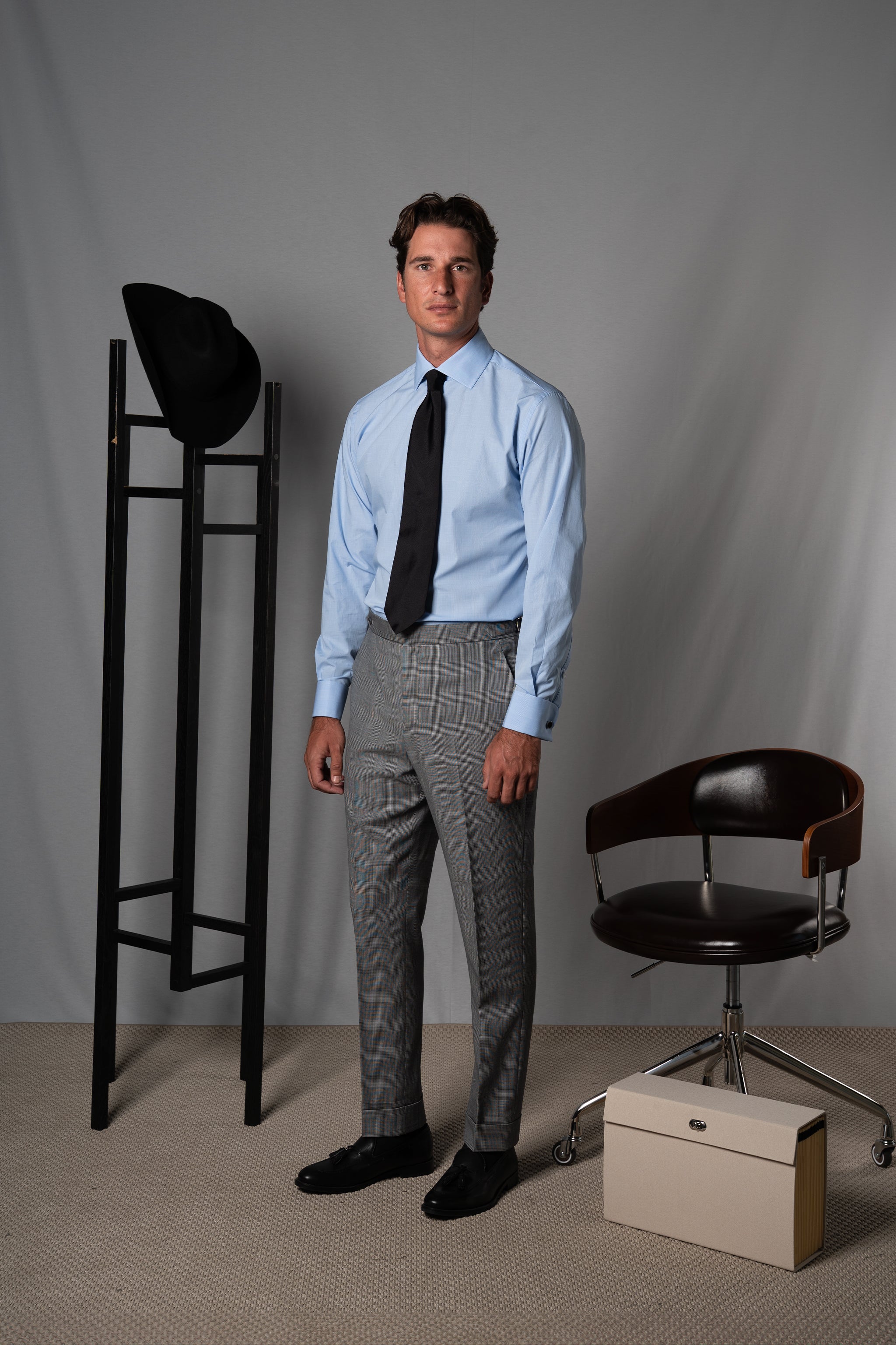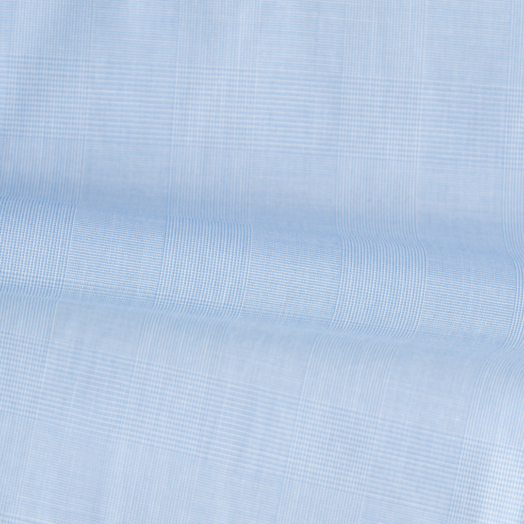 Camisa de algodón azul claro con trama tipo Príncipe de Gales, ligera, fresca y con una textura única que eleva lo clásico. El corte business asegura una silueta impecable, ideal para traje o americana.