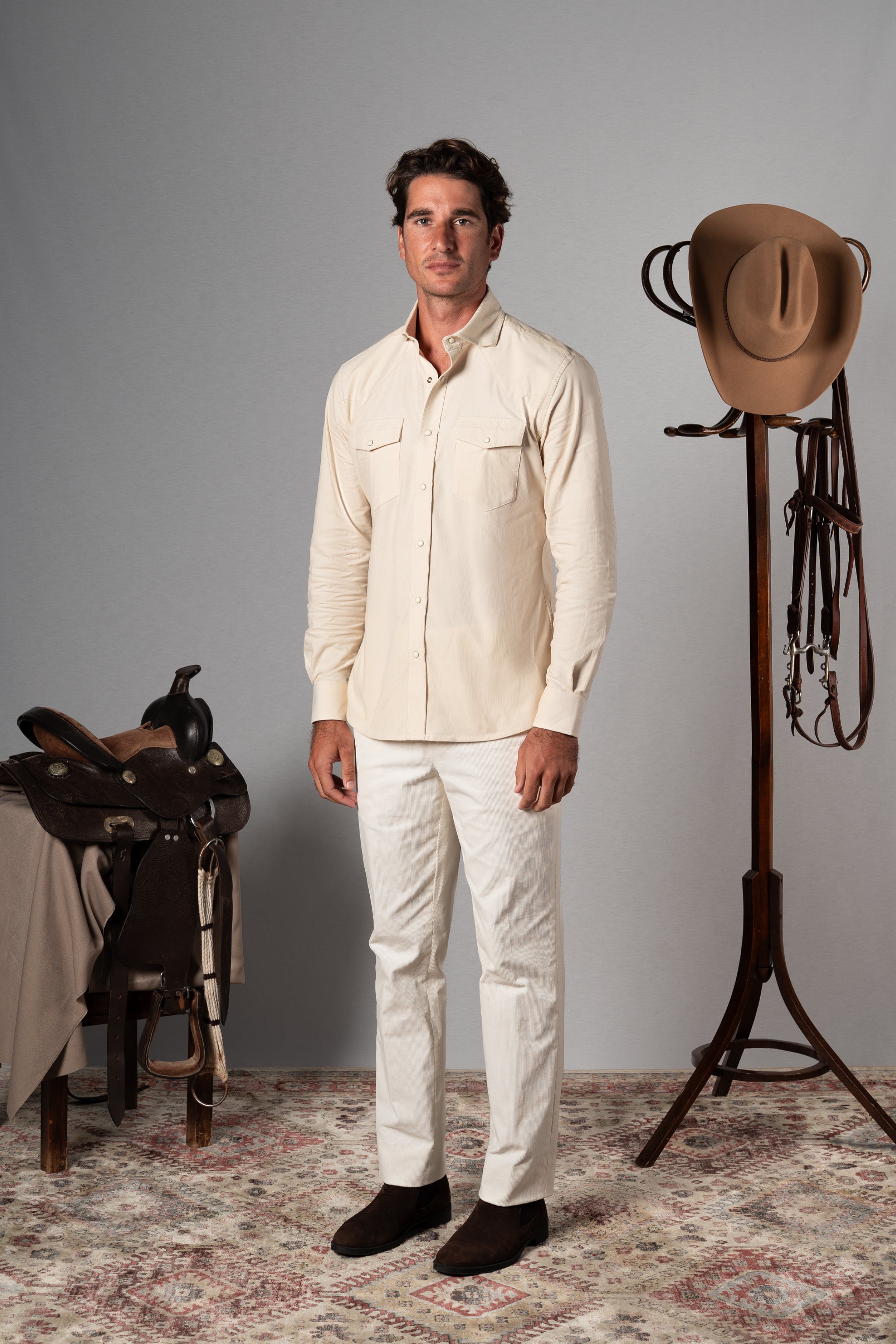Esta camisa de micropana color crudo reinterpreta el clásico diseño western en un tejido suave y cálido, ideal para los meses más frescos. Su tejido de micropana 100% algodón aporta textura fina y una caída natural, manteniendo el equilibrio entre confort y elegancia.