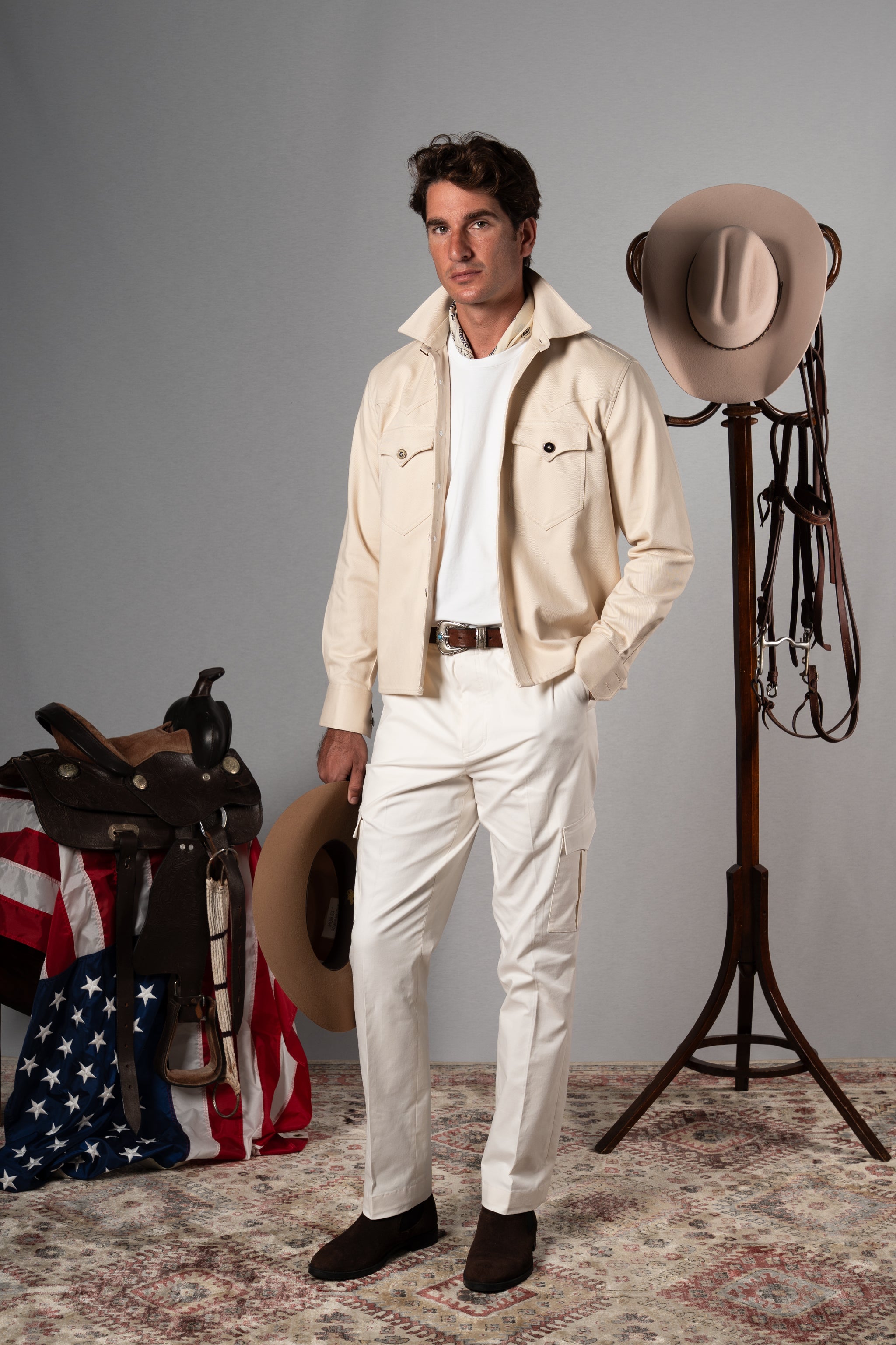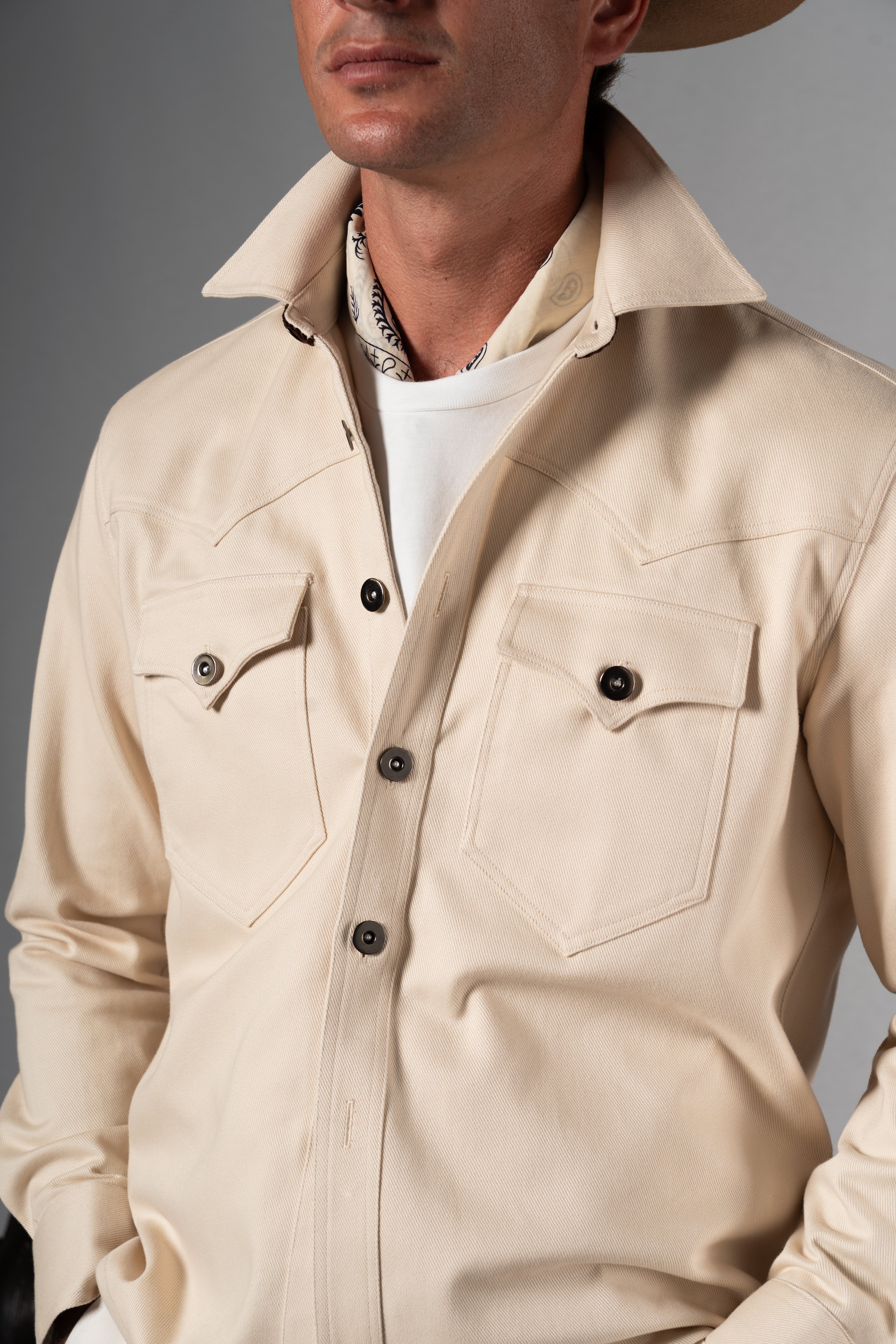 Esta sobrecamisa en sarga de algodón color crudo combina inspiración funcional con una silueta contemporánea. Su diseño cropped, con claros detalles de estilo western, destaca por los bolsillos de pecho con tapeta en punta, el doble botón en el puño y los botones metálicos, que aportan personalidad y presencia.