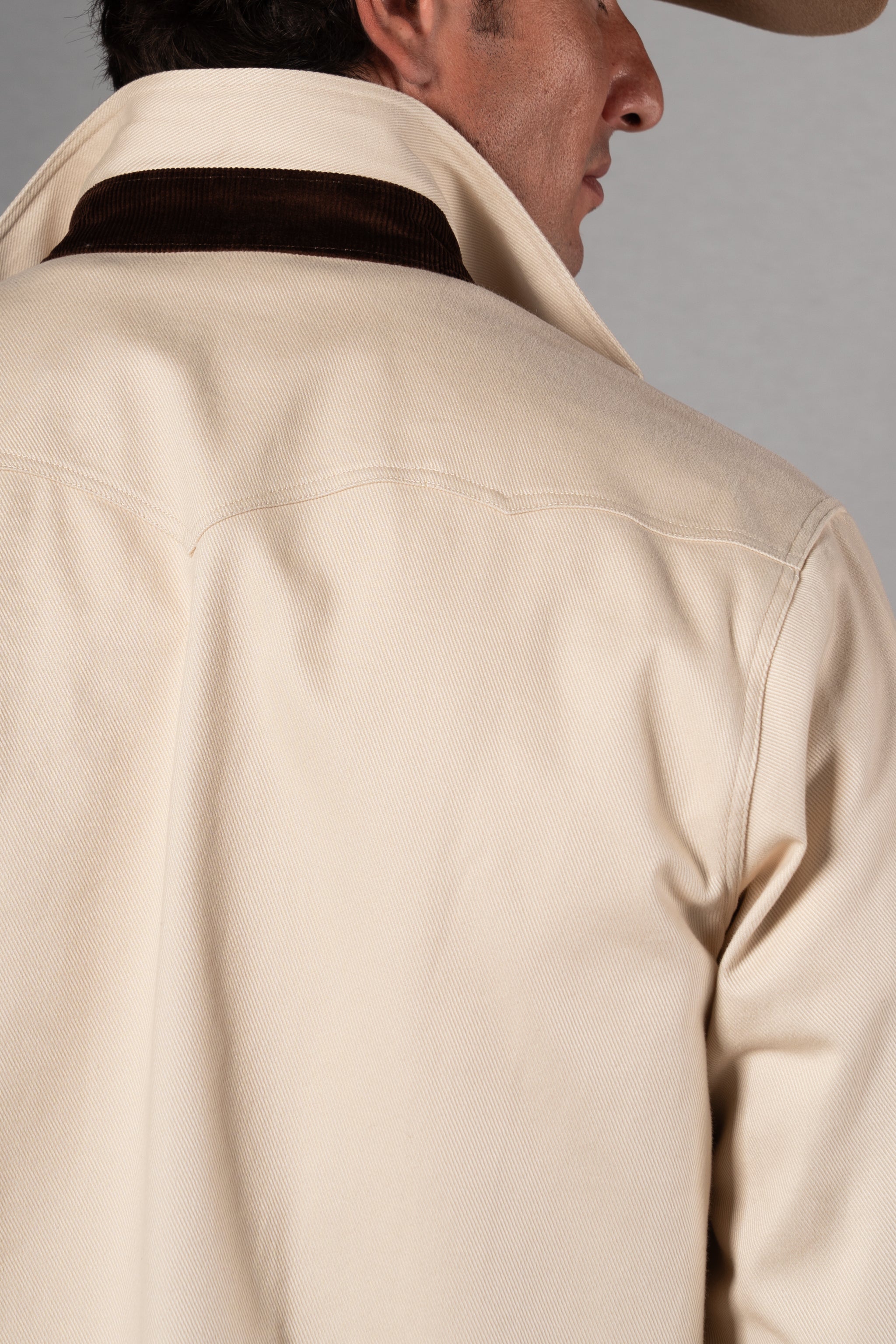 El detalle del cuello con felpilla de pana marrón añade contraste y calidez, mientras que el tejido de sarga de algodón ofrece cuerpo, durabilidad y una textura suave al tacto.
