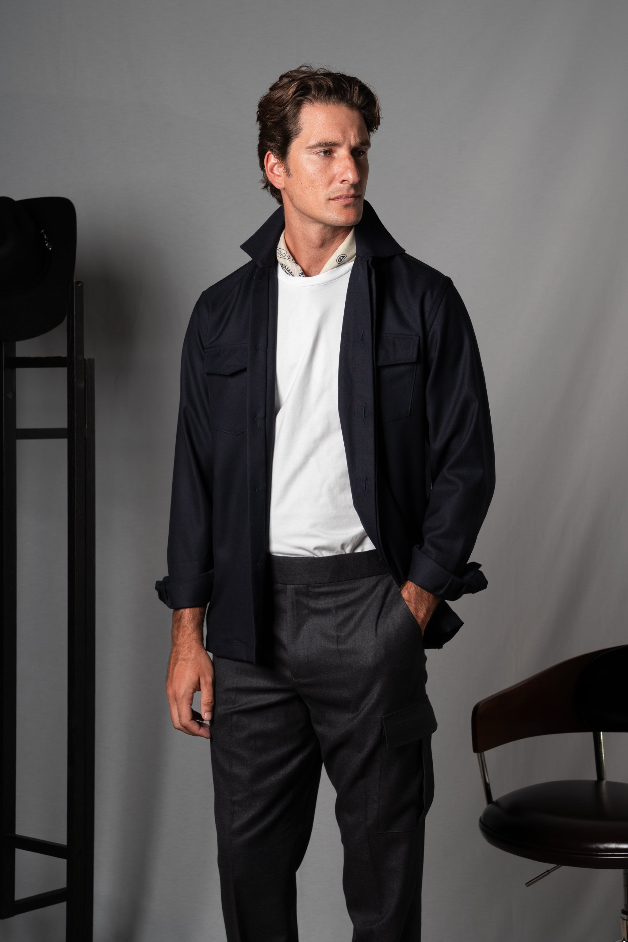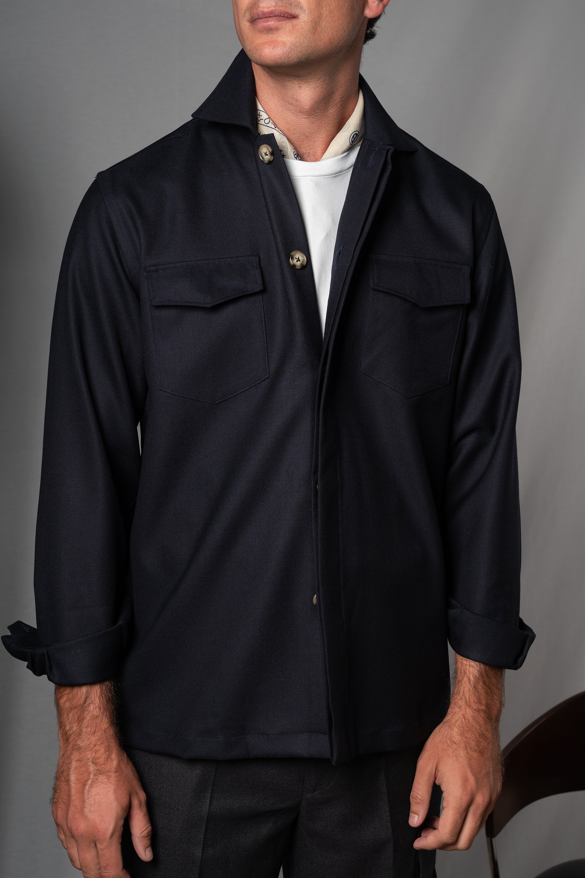 Short-sleeved and crafted from navy seersucker, its Miami collar and lightweight construction make it a must-have when the heat is on. It doesn't cling to the body, doesn't lose shape, and doesn't go unnoticed.