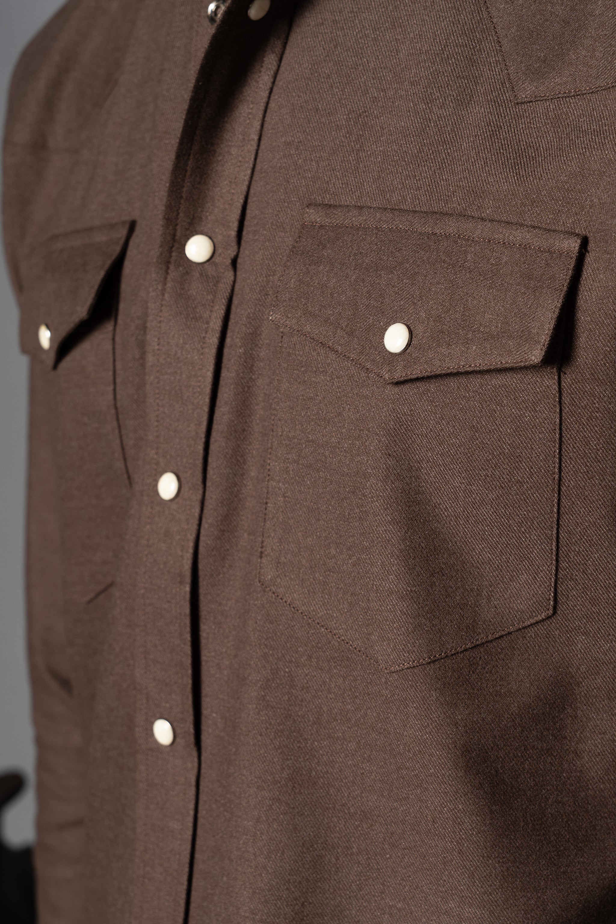 Esta camisa de viyela color marrón está confeccionada en 100% algodón, con un acabado suave y ligeramente afelpado que aporta confort y un aspecto refinado. Su diseño parte de la clásica camisa western, con bolsillos de pecho con tapeta en pico y botones de corchete metálicos, pero incorpora un cuello cutaway con botón oculto que permite combinarla también con americana, elevando su versatilidad.