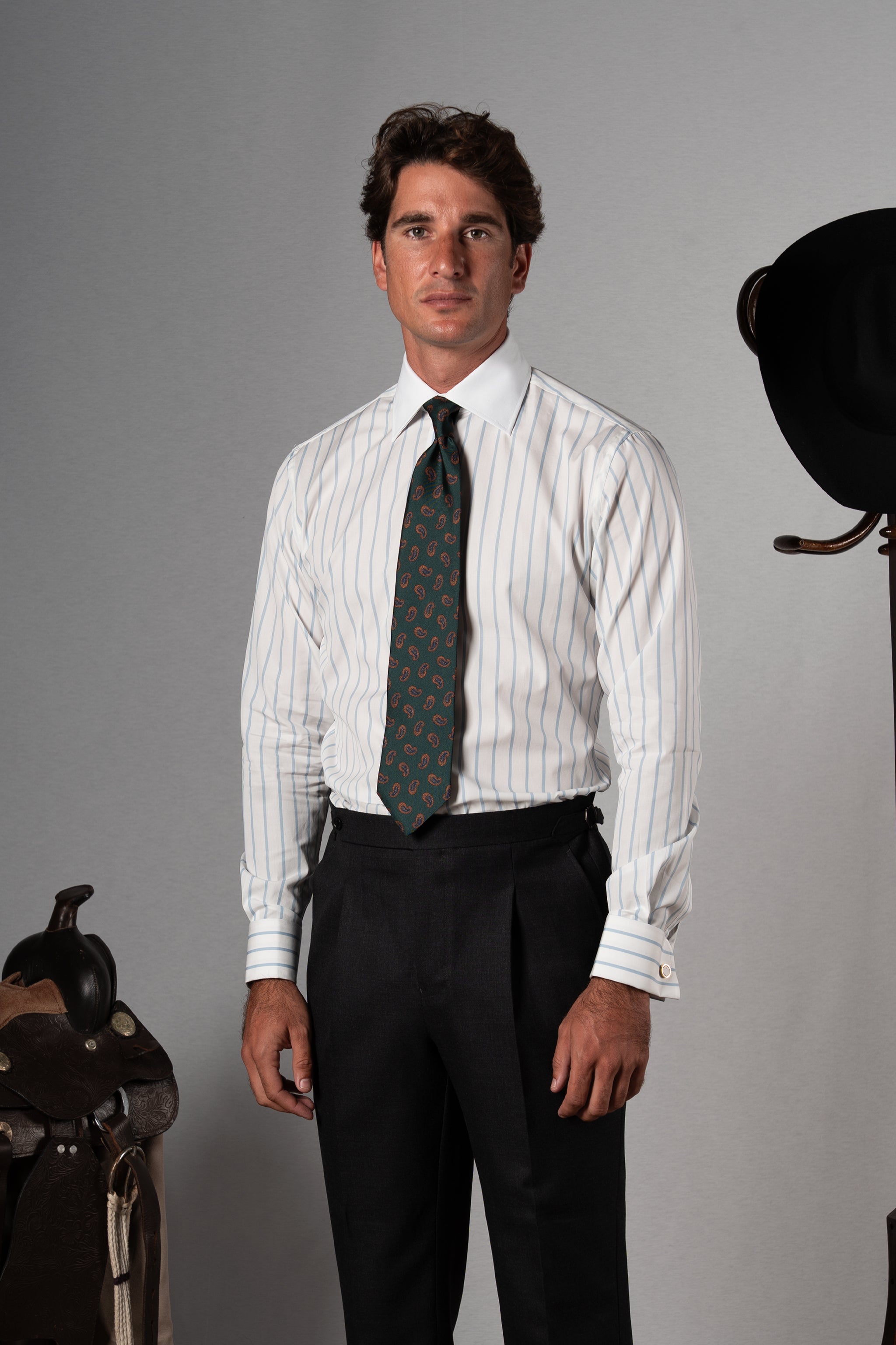 Esta camisa de rayas finas azul celeste, confeccionada en popelín 100% algodón, destaca por su cuello blanco contrastado, un detalle clásico que aporta luminosidad y distinción. El tejido ligero y suave al tacto mantiene una estructura impecable durante todo el día, ofreciendo comodidad y presencia a partes iguales.