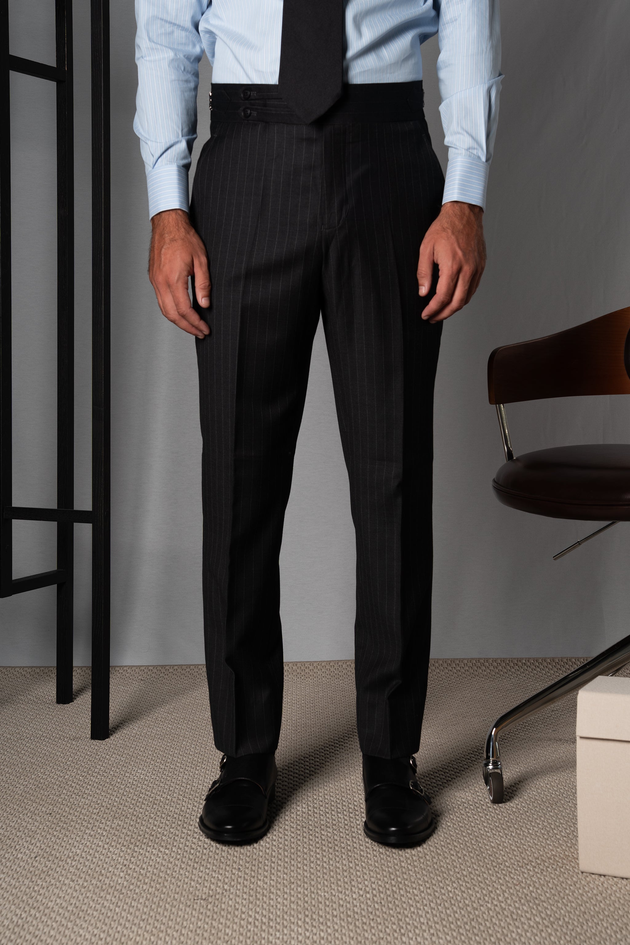 El corte clásico actualizado estiliza la figura y la raya vertical alarga la silueta, logrando una estética imponente sin perder comodidad.