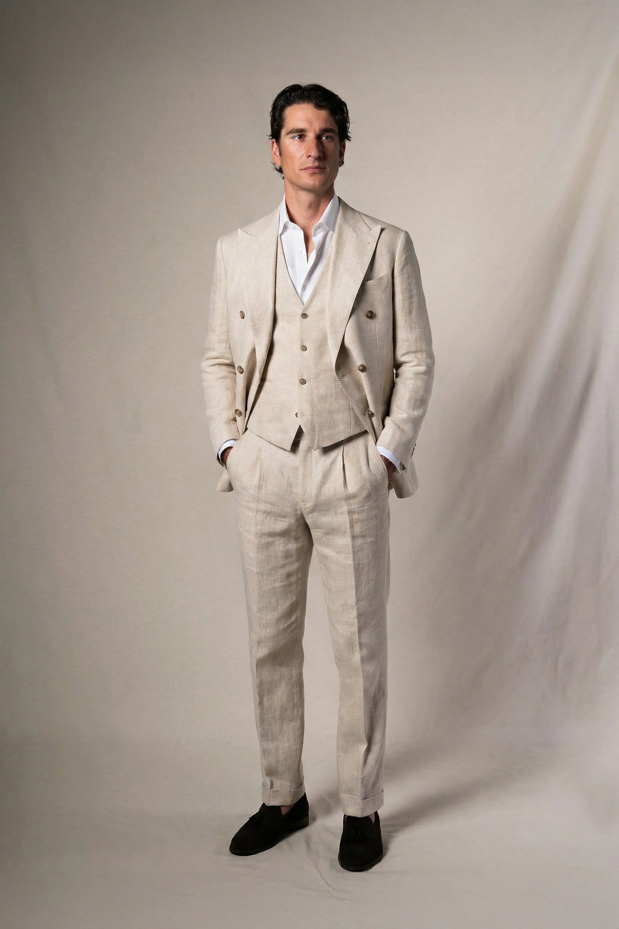 Traje de lino de tres piezas, ideal para bodas en la playa