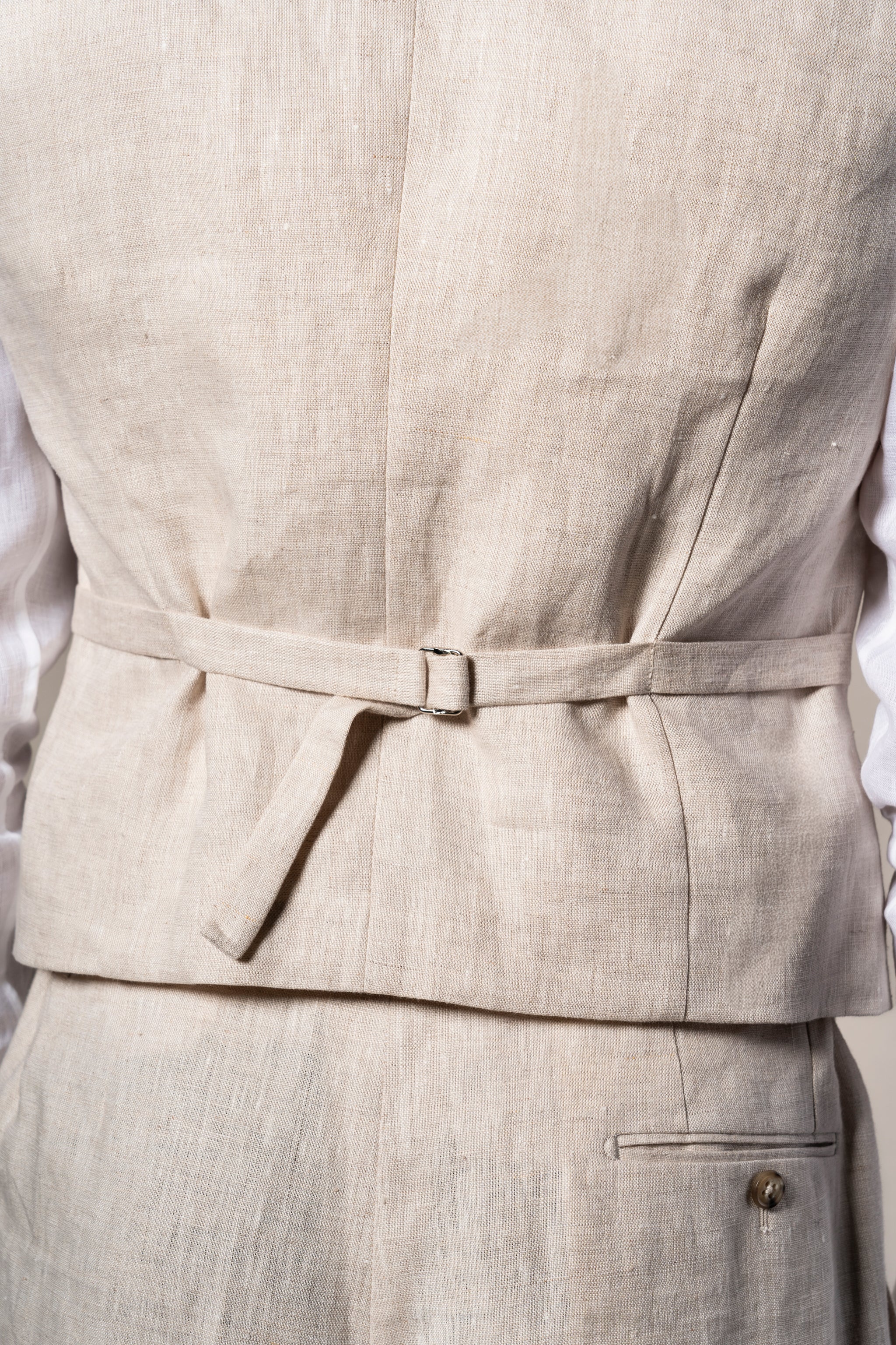 Confeccionado en lino de alta calidad, el conjunto destaca por su ligereza, transpirabilidad y caída natural, convirtiéndose en una opción ideal para entornos cálidos y ceremonias al aire libre, sin renunciar a una presencia sofisticada y cuidada.