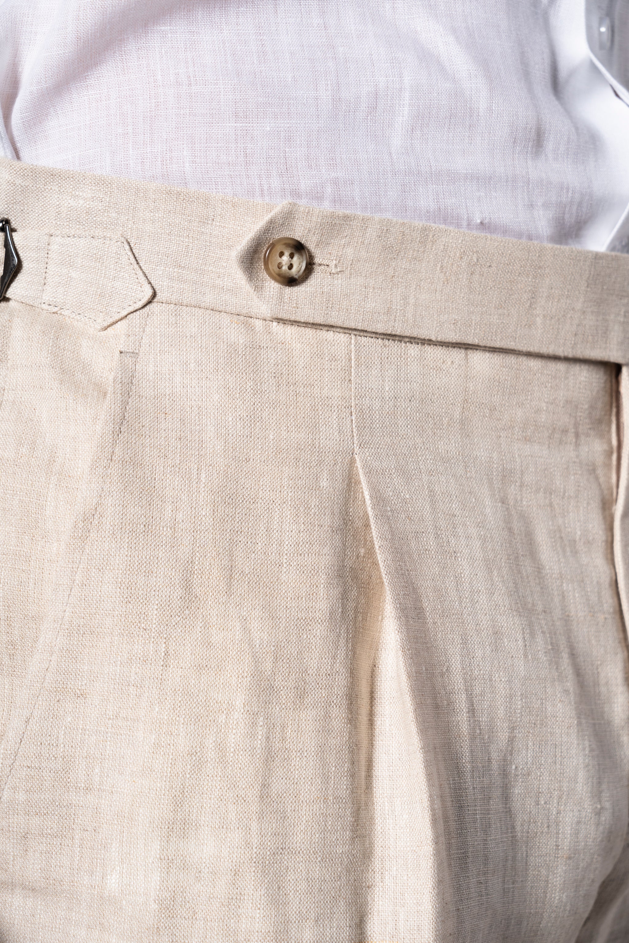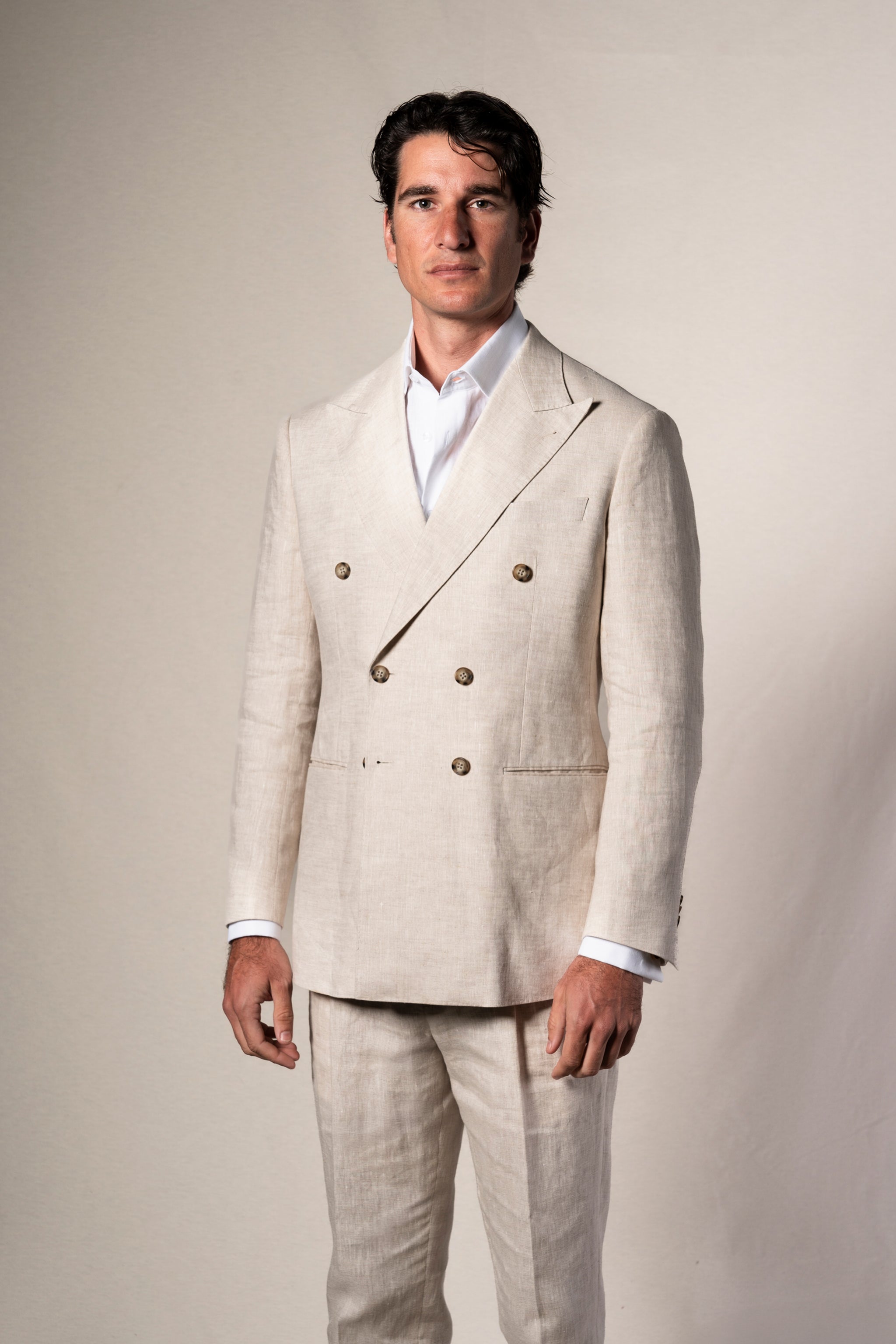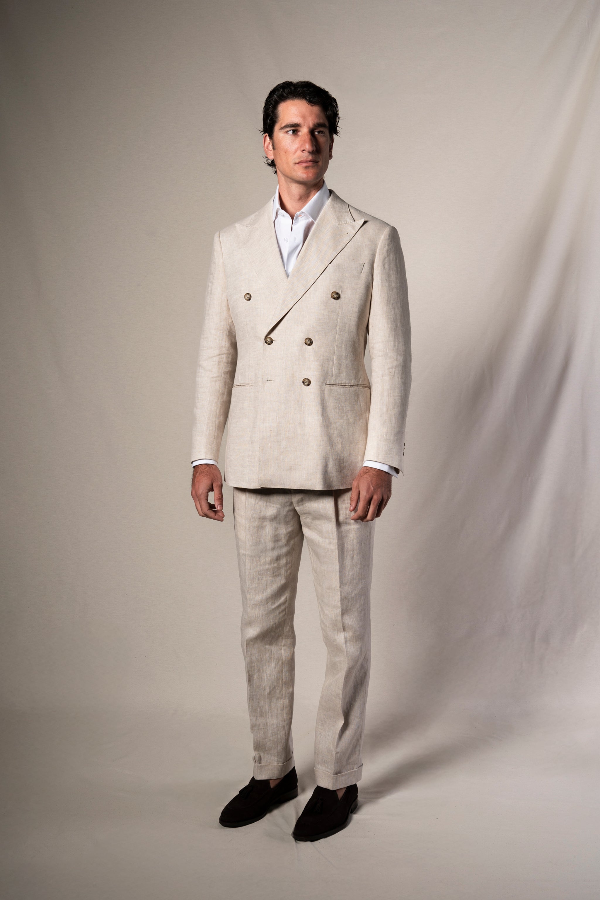 Confeccionado en lino de alta calidad, el conjunto destaca por su ligereza, transpirabilidad y caída natural, convirtiéndose en una opción ideal para entornos cálidos y ceremonias al aire libre, sin renunciar a una presencia sofisticada y cuidada.
