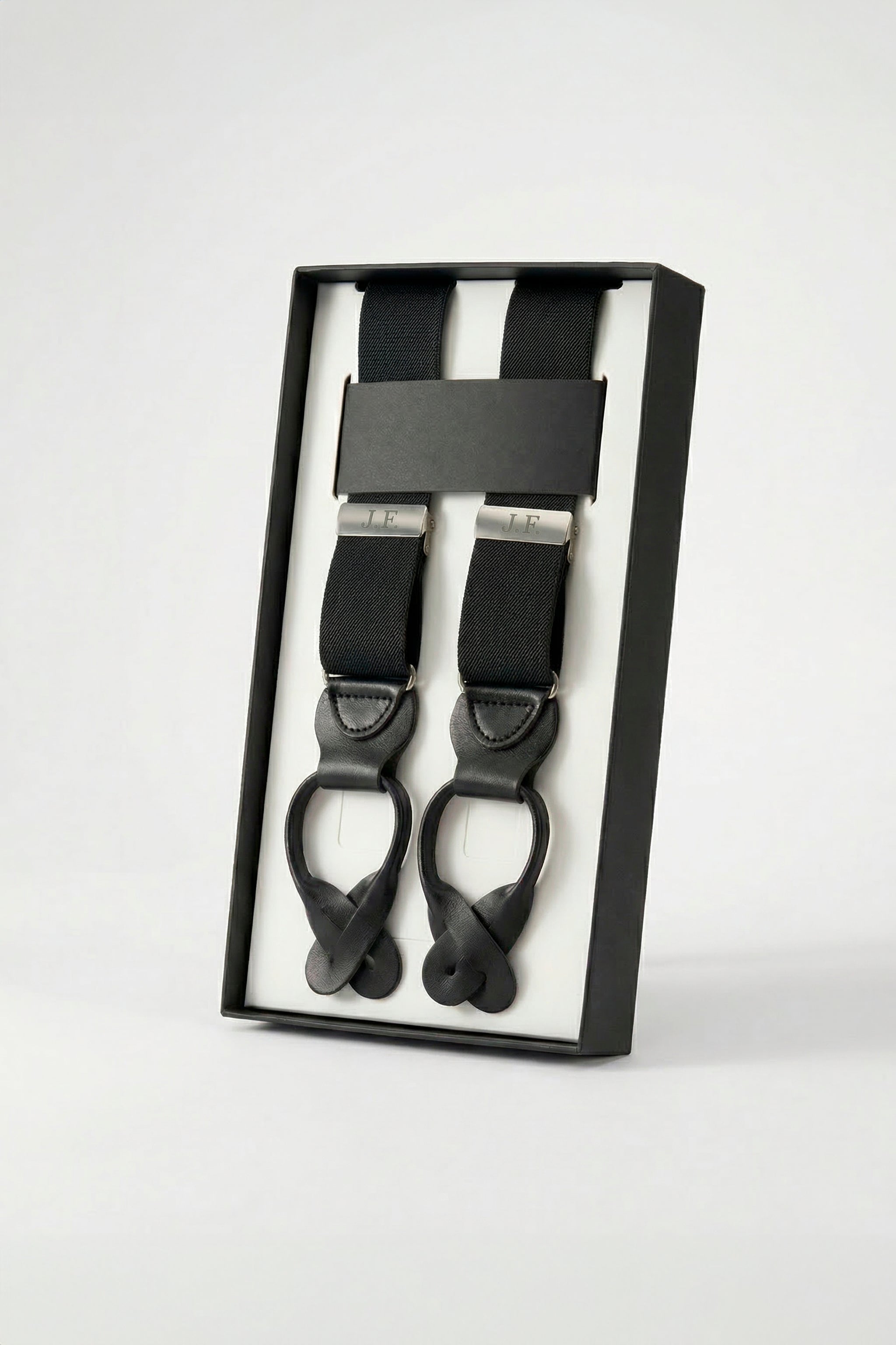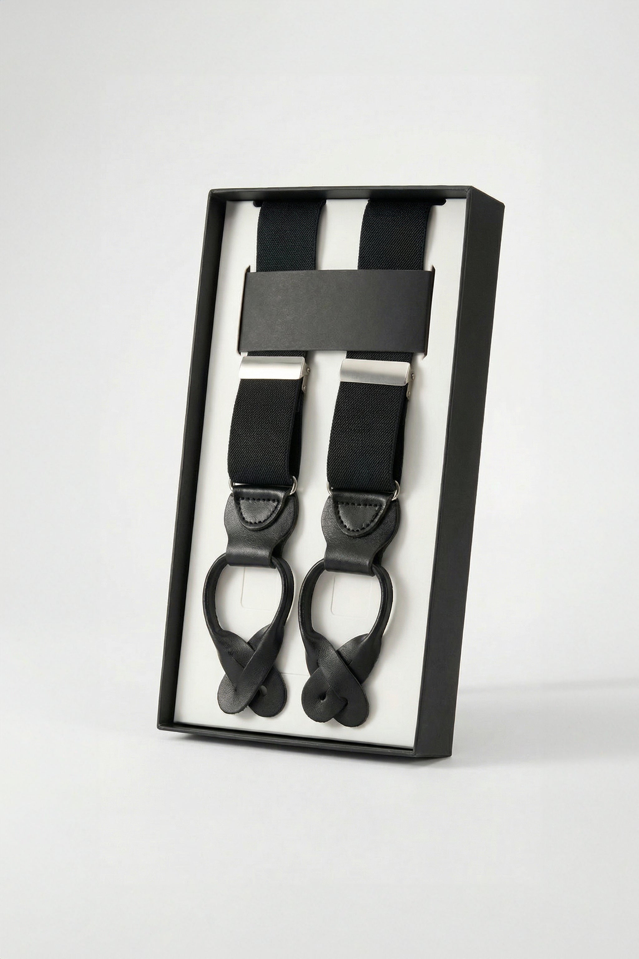 Tirantes lisos de sastrería confeccionados en un tejido ligeramente elástico. Estampado liso con sujeción de latiguillo exclusivamente para uso con botones.