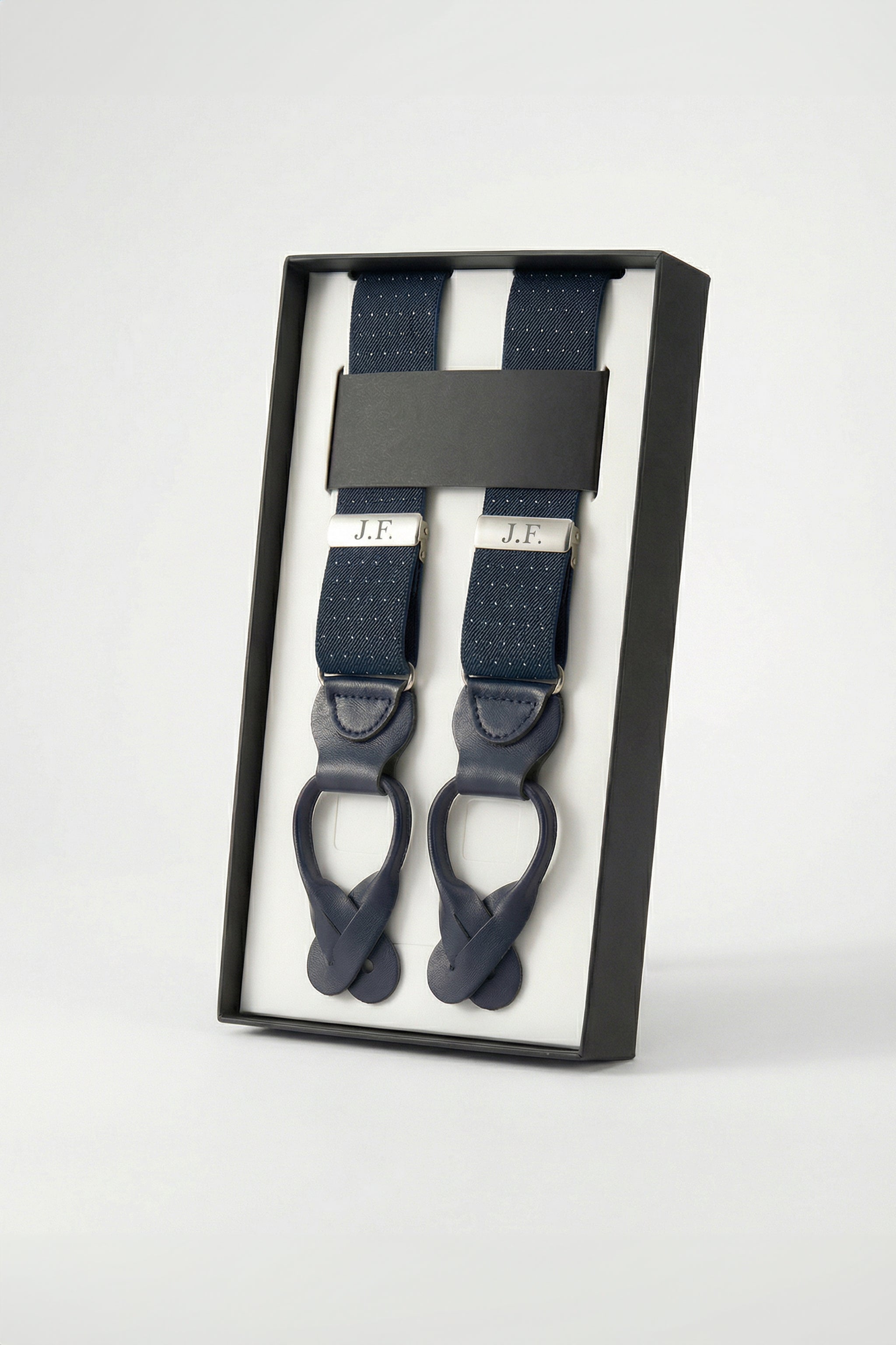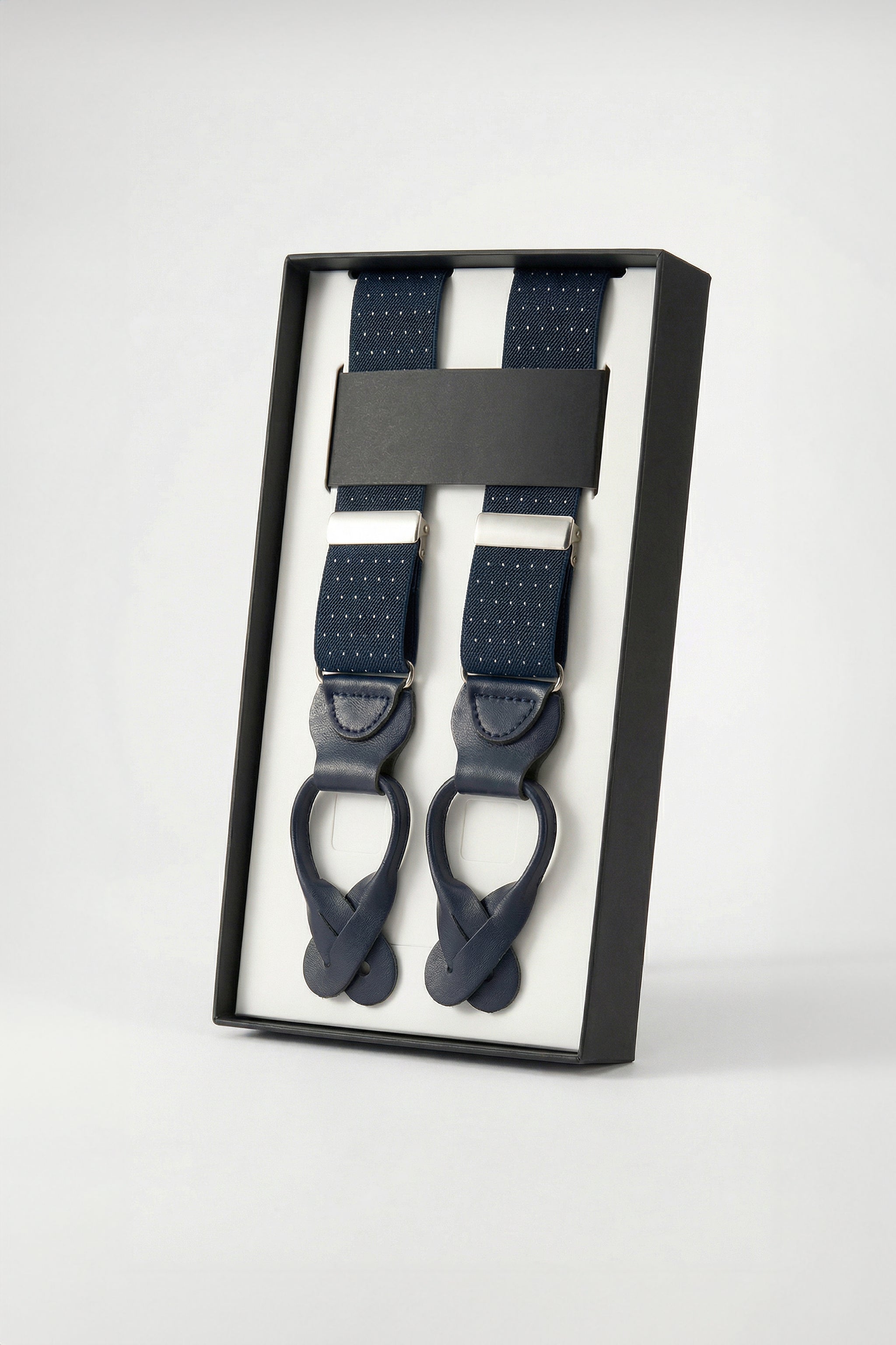 Tirantes azul marino de sastrería confeccionados en un tejido ligeramente elástico. Estampado de micropuntos con sujeción de latiguillo exclusivamente para uso con botones.