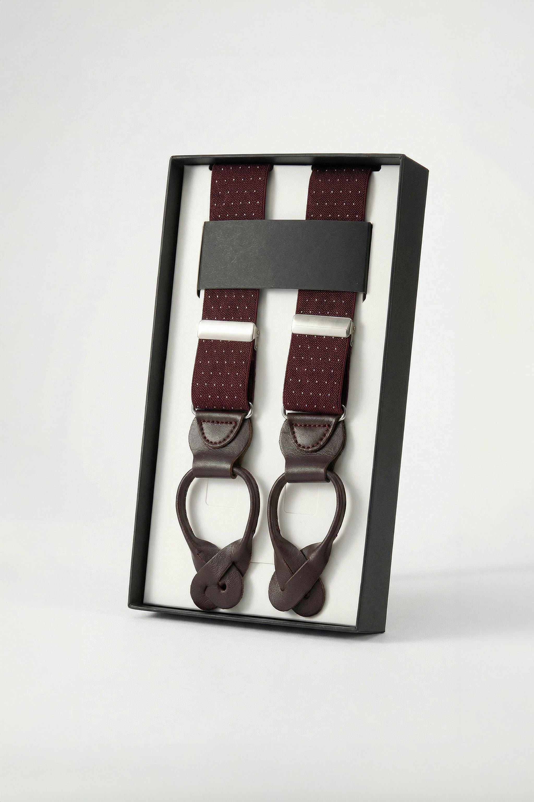 Tirantes granate de sastrería confeccionados en un tejido ligeramente elástico. Estampado de micropuntos con sujeción de latiguillo exclusivamente para uso con botones.