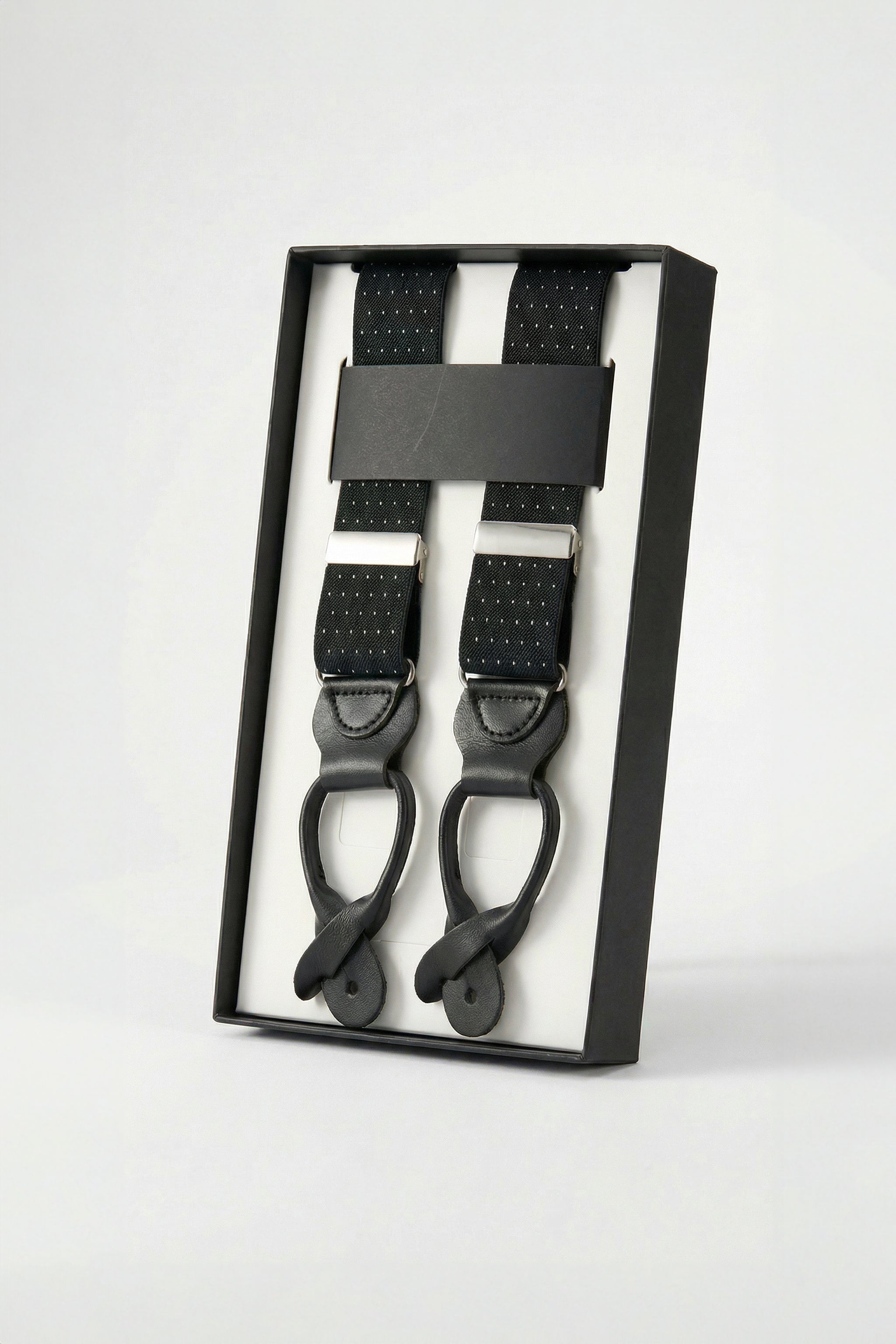 Tirantes negros de sastrería confeccionados en un tejido ligeramente elástico. Estampado de micropuntos con sujeción de latiguillo exclusivamente para uso con botones.